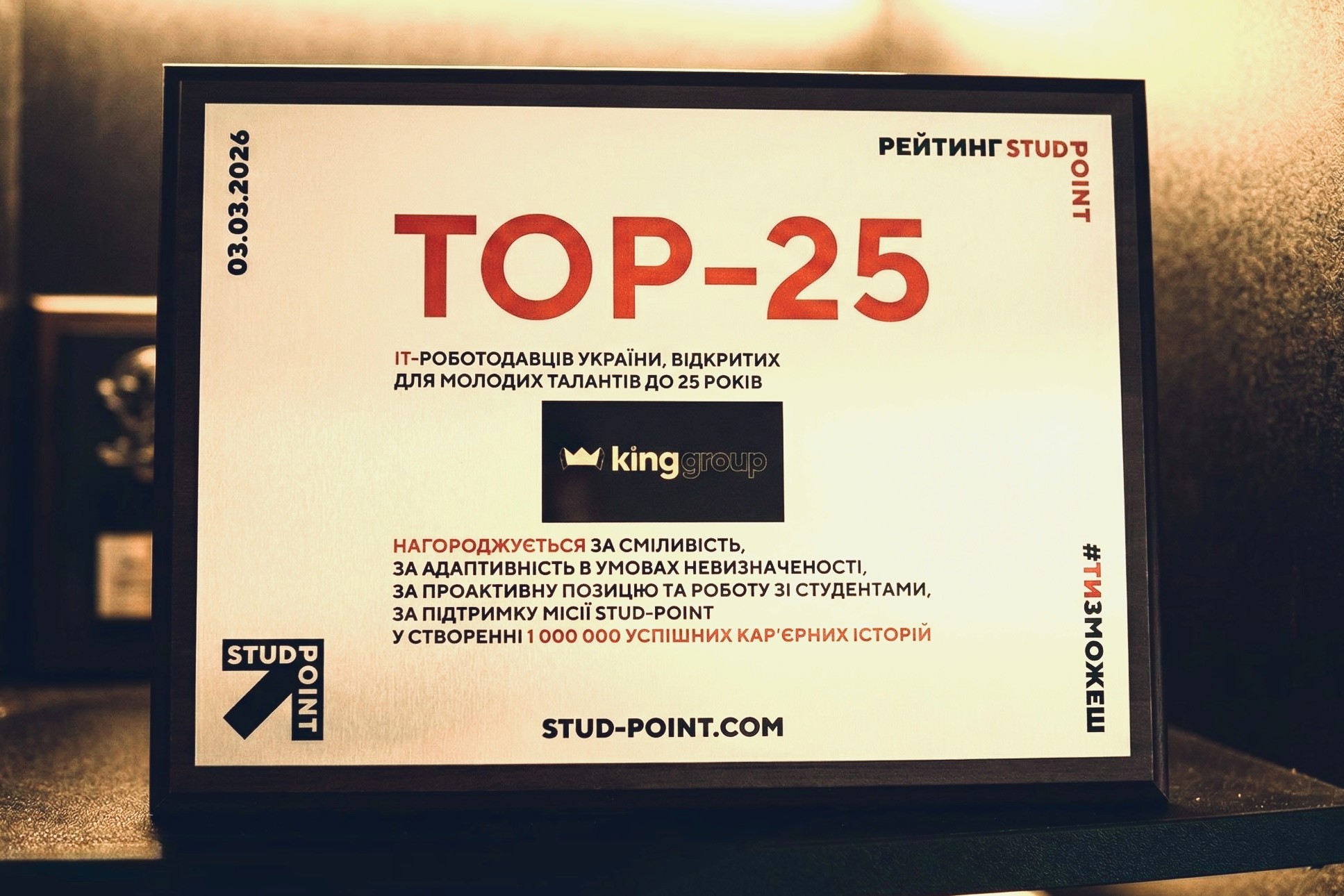 King Group увійшла до рейтингу ТОП-25 IT-роботодавців України, відкритих для молодих талантів до 25 років, за результатами незалежного оцінювання STUD-POINT. Нагороду Група отримала під час HR-POINT 2026 — щорічного форуму для HR-фахівців, присвяченого роботі з молоддю, розвитку бренду роботодавця та майбутньому ринку праці.